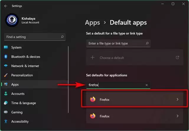 接下来,在“按应用设置默认值”下方,找到“搜索应用”框。在这里输入你电脑上当前默认浏览器的名称。比如,我的电脑上默认是 Mozilla Firefox。如果你不太确定,那很可能是系统自带的 Microsoft Edge。