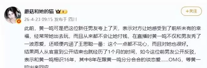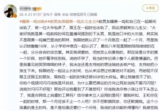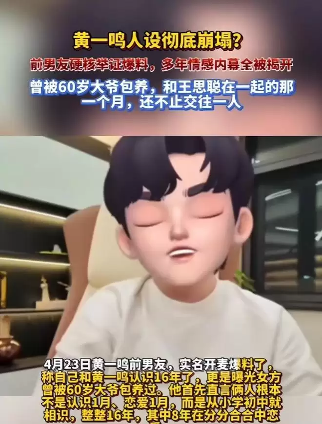 那个吃了三年“王思聪孩子妈”红利的网红,被青梅竹马锤懵了 靠着“王思聪孩子妈”这个人设吃了三年流量红利的网红黄一鸣,这次可能真的遇到麻烦了。出手的不是别人,正是她相识16年的青梅竹马前男友。一条实名发布的视频,不仅曝出她被60岁大叔包养的过往,更直接抛出一个炸翻全网的疑问:孩子,真是王思聪的吗? 时