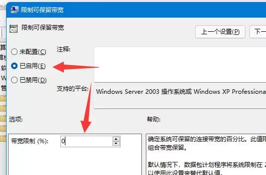6. 最后一步,在弹出的设置窗口中,将左上角的选项从“未配置”或“已禁用”更改为 “已启用”。紧接着,你会发现下方的“带宽限制”百分比可以修改了,请务必将数值调整为 “0”。这意味着系统将不再保留任何带宽用于其他目的。完成后,点击“确定”保存设置。至此,操作就全部完成了。