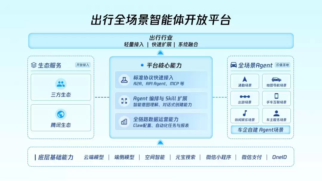 在技术开放日上,腾讯推出了出行全场景智能体开放平台。这个平台的核心逻辑很清晰:就是“做好底座”,向车企等生态合作伙伴“开放能力”。
