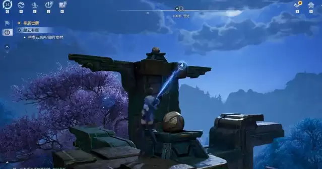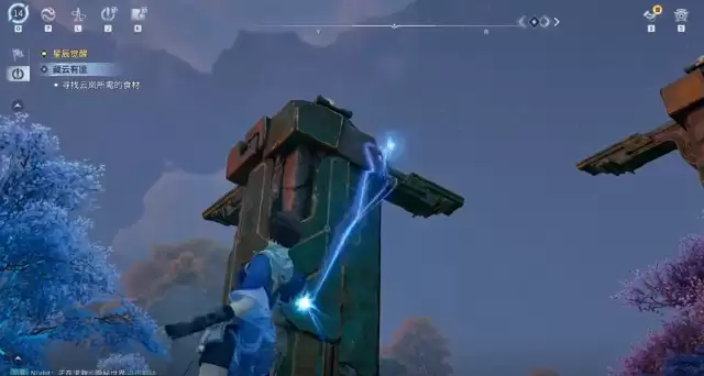 首先,站回初始位置。地上散落着一些碎片先别管,把视线往左边挪。看到第一根能互动的柱子了吗?靠近它,按下交互键爬上去。到了顶上,找到那个机关,动手旋转上面的铁球。