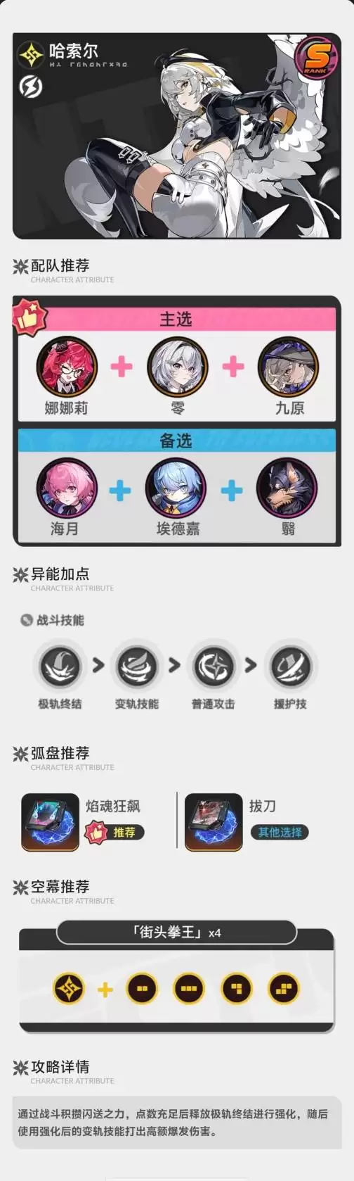 通常,在进入战斗后,应优先让增益辅助角色上好状态,并为哈索尔充能。待增益效果齐全、能量就绪时,再切换哈索尔入场,打出整套爆发技能。切忌让她第一个冲进场,在没有支持的情况下,她的生存和输出都会大打折扣。