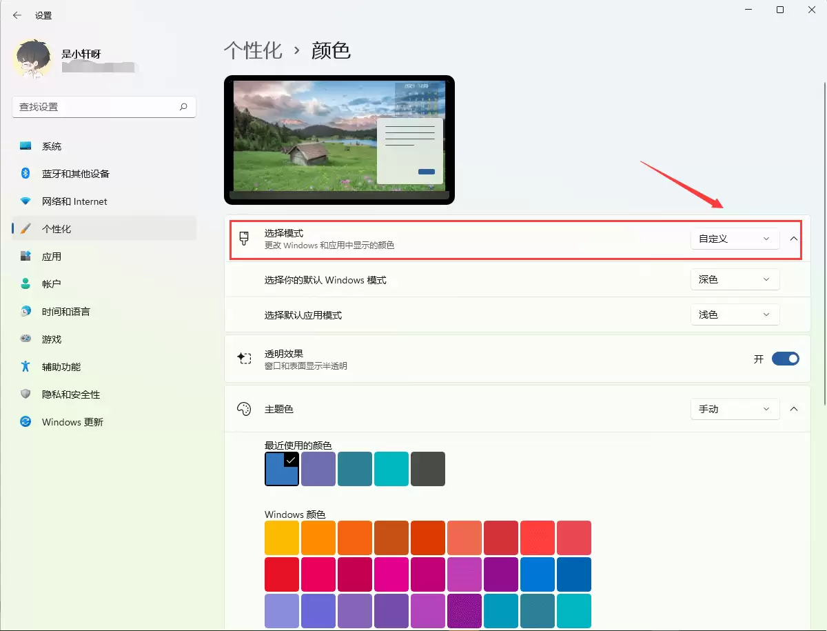 如果你不想安装额外软件,Win11其实也提供了原生的透明化选项,只不过效果是整体性的“亚克力”模糊透明,而非完全透明。具体路径在这里: