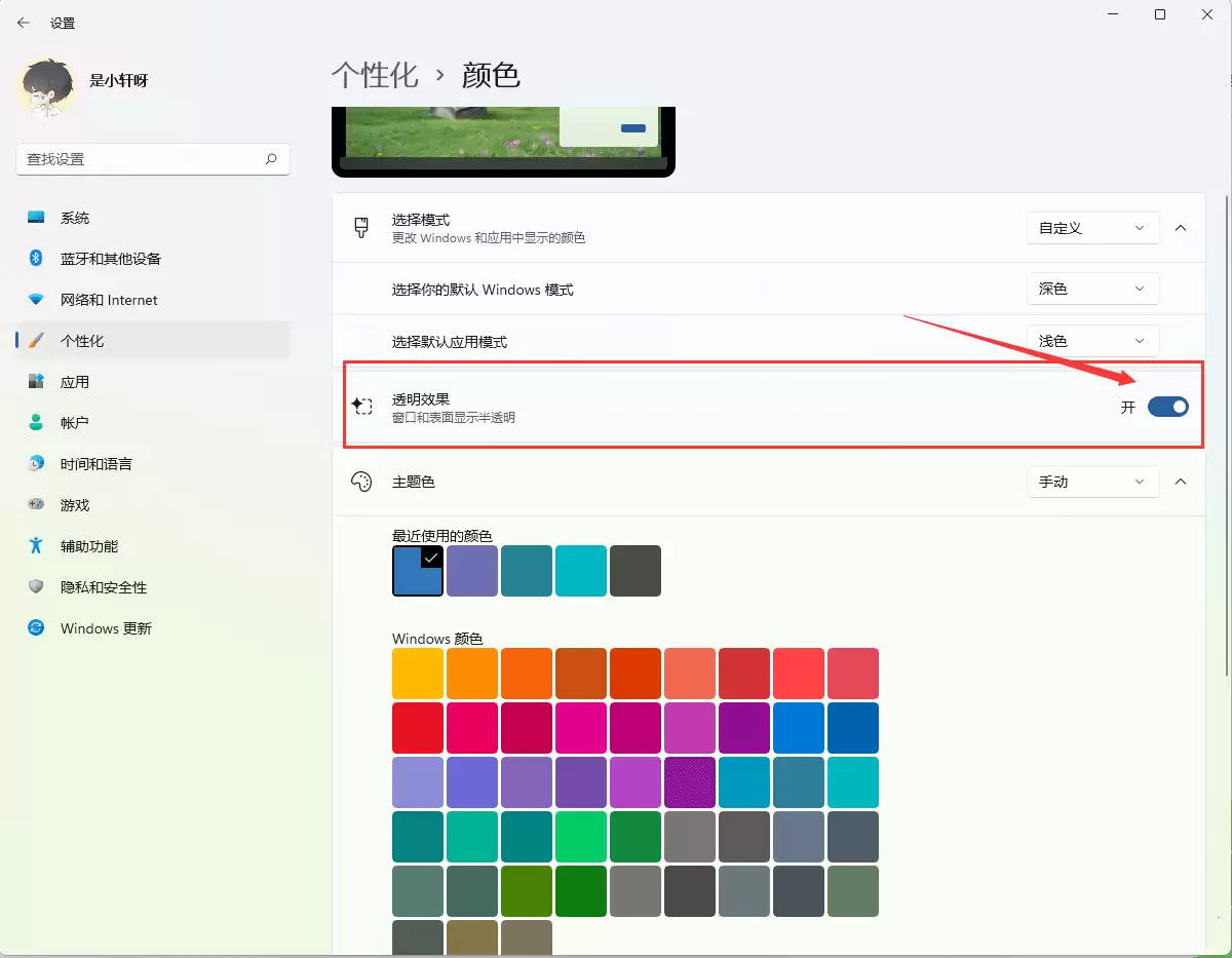 5. 最后,找到“透明效果”这个开关,将它【打开】。这样一来,包括任务栏在内的窗口都会呈现出柔和的半透明效果。