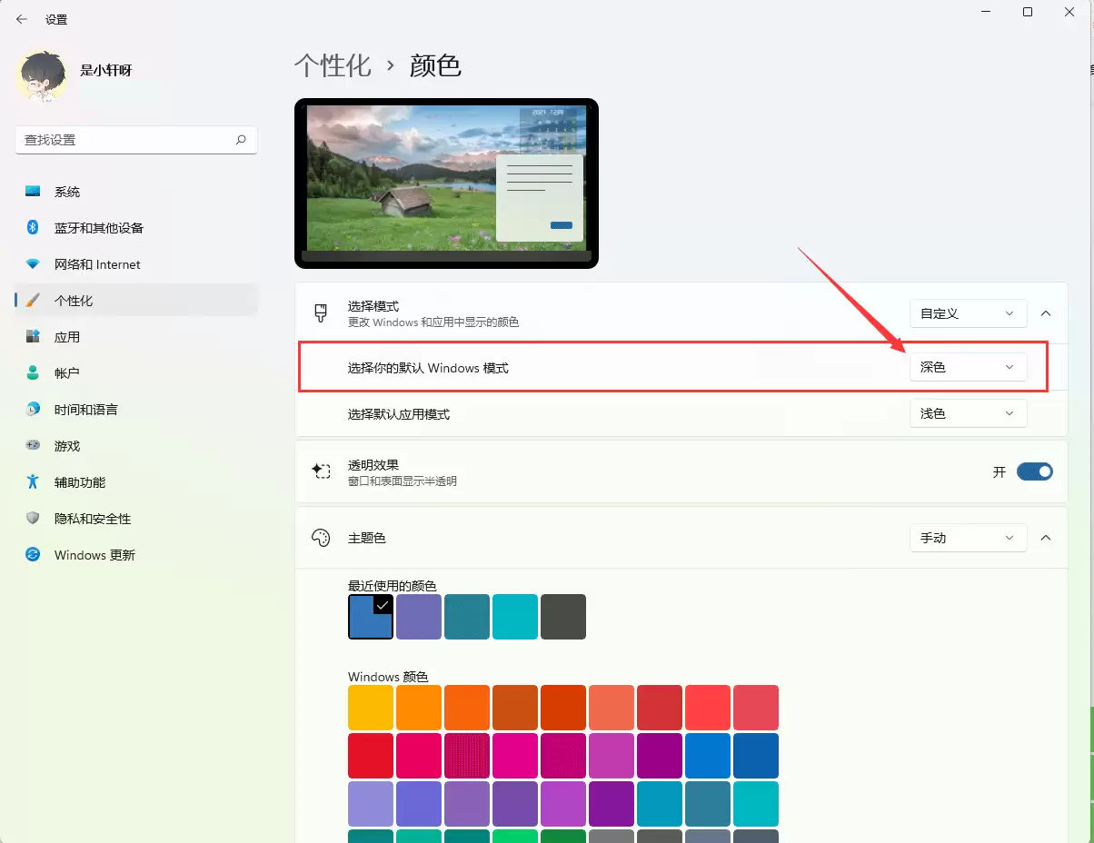 3. 接下来是关键步骤:在“选择你的默认 Windows 模式”下,选择【深色】。