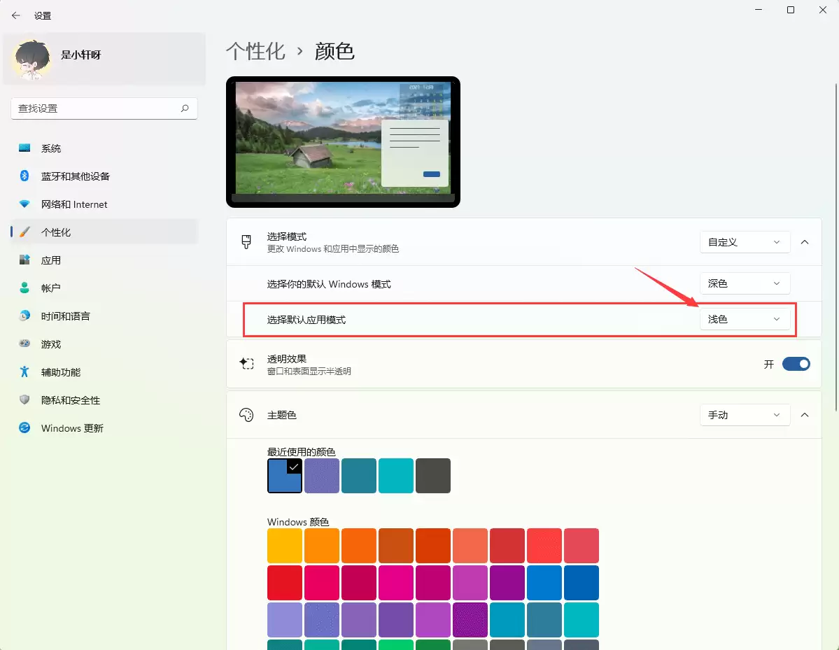 4. 然后,在“选择默认应用模式”下,选择【浅色】。