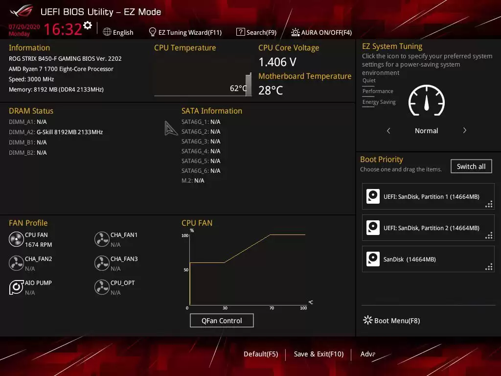 1. 开机或重启电脑,当屏幕出现华硕Logo时,迅速并连续按键盘上的 DEL 键,进入BIOS界面。进入后,按F7键切换到“Advanced Mode”(高级模式)。