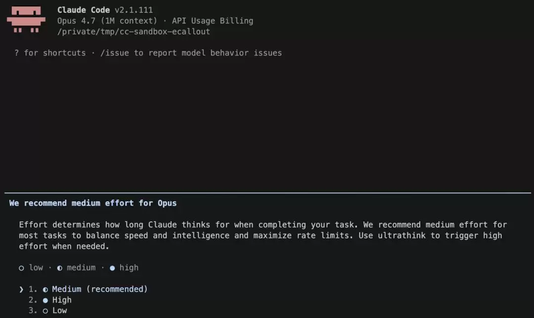 为此,Anthropic对默认设置动了一次手术。Claude Code里的“工作量级别”功能,其设计初衷是让用户在“思考时间、输出质量和成本”三者之间做出自己的权衡。内部测试显示,中等强度虽然在智能表现上略有妥协,但能显著降低延迟、避免极端的等待时间,同时提高使用效率。于是,团队一度将默认模式切换为“中”,并通过产品内的弹窗向用户说明了情况。