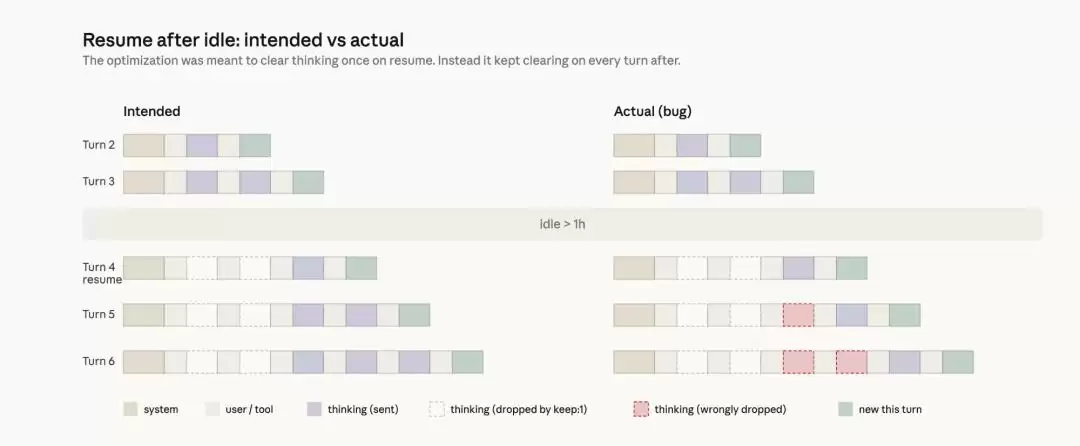 2、缓存优化漏洞致模型“健忘”:3月26日上线的一个会话缓存优化功能,本意是好的——清除闲置超过一小时的会话历史思维记录,以降低延迟。但程序出了个漏洞,导致这个清除操作在会话的剩余时间里被反复触发。结果就是,模型开始出现回答重复、工具选择异常的情况。该漏洞在4月10日被修复,影响范围覆盖了Sonnet 4.6与Opus 4.6版本。