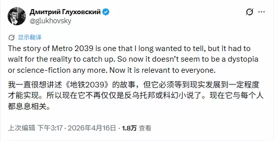 今天,《地铁2033》的编剧、同时也是新作《地铁2039》编剧的德米特里·格鲁霍夫斯基,在X平台上发布了一段引人深思的发言。原文是这样说的: