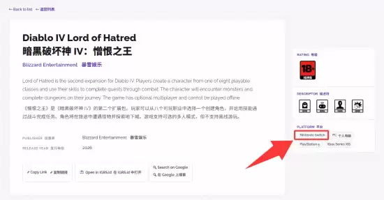 近期,一则来自海外游戏评级数据库的新发现,引发了玩家社区的广泛关注与热议。有细心玩家在印度尼西亚IGRSDB的评级条目中发现,《暗黑破坏神4:憎恨之王》的平台信息中,赫然列出了“Nintendo Switch”。这一信息迅速传播开来,让众多玩家不禁猜想:这是否意味着《暗黑破坏神4》即将登陆任天堂的下一代Switch主机(暂称NS2)?