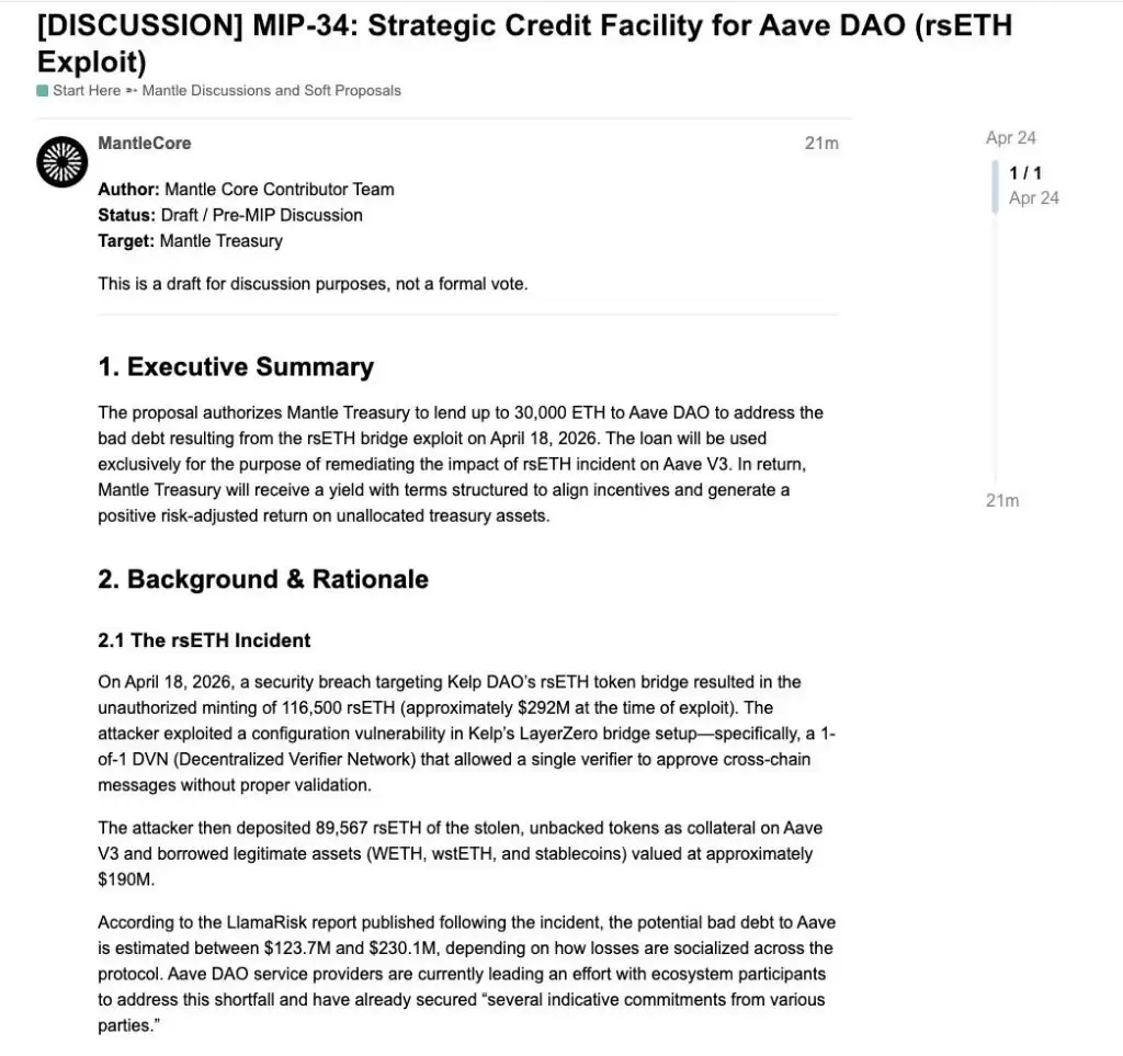 Mantle 已针对 2026 年 4 月 18 日 rsETH 桥漏洞利用事件造成的有害后果做出回应,提交了一份提案,旨在为 Aa ve DAO 提供关键的流动性支持。