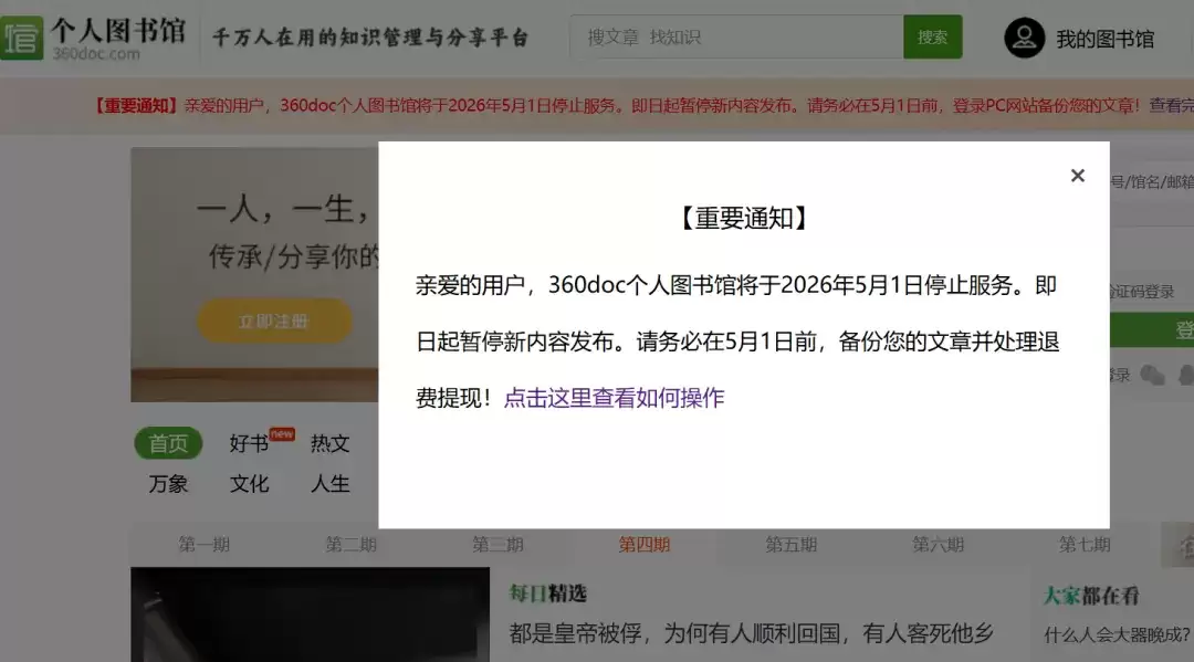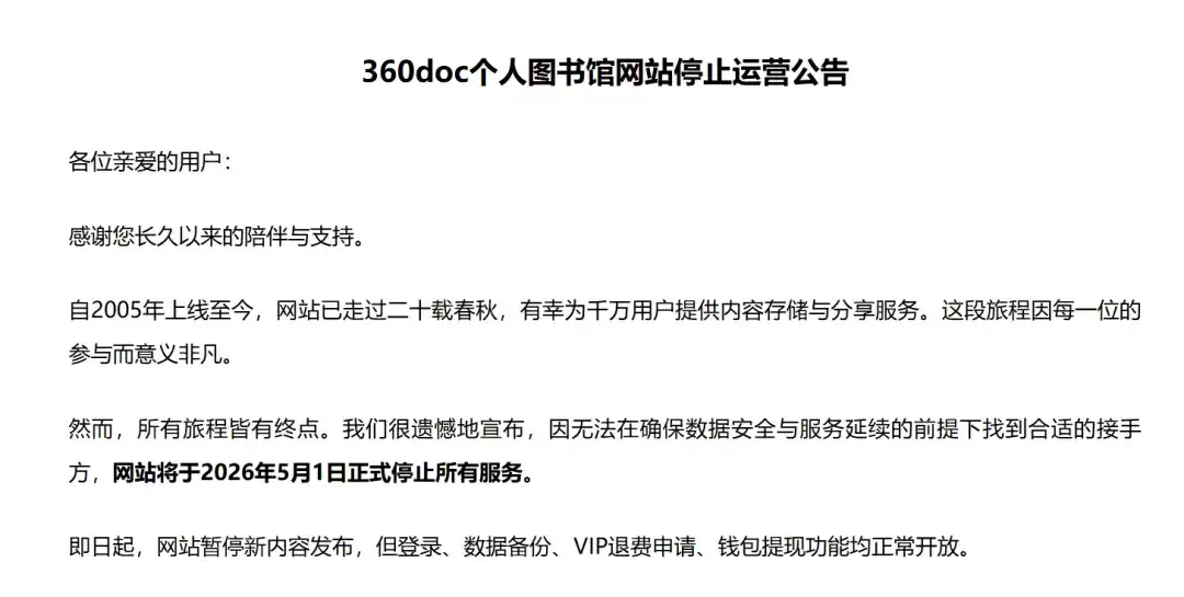 在发布无偿转让公告未果后,360doc个人图书馆随即公布了关停决定。其网站主页的提示清晰而直接:“360doc个人图书馆将于2026年5月1日停止服务。”