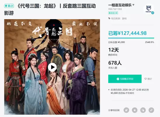 《代号三国:龙起》众筹火爆开启,真人互动影游再添史诗新作 近日,游戏圈传来重磅消息:由钟晨瑶、王星辰等知名演员领衔主演的三国题材真人互动影像游戏《代号三国:龙起》,其官方众筹活动已在摩点平台正式启动。游戏同时宣布定档4月28日,届时将同步上线Steam平台,引发玩家广泛期待。 本次众筹的市场反响极为