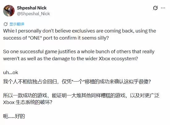当然,这种怀疑并非空xue来风。Shpeshal_Nick进一步分析道,即便未来有几款移植到其他平台的游戏取得了亮眼的销售数据,这也不足以成为一个决定性的风向标。单点成功很难证明整个移植策略的普适性,换句话说,一两款游戏的胜利无法保证其他作品能复制同样的成功。更重要的是,此举对Xbox自身硬件生态和品牌忠诚度可能造成的长期损害,远非几款游戏的短期营收所能轻易抵消。
