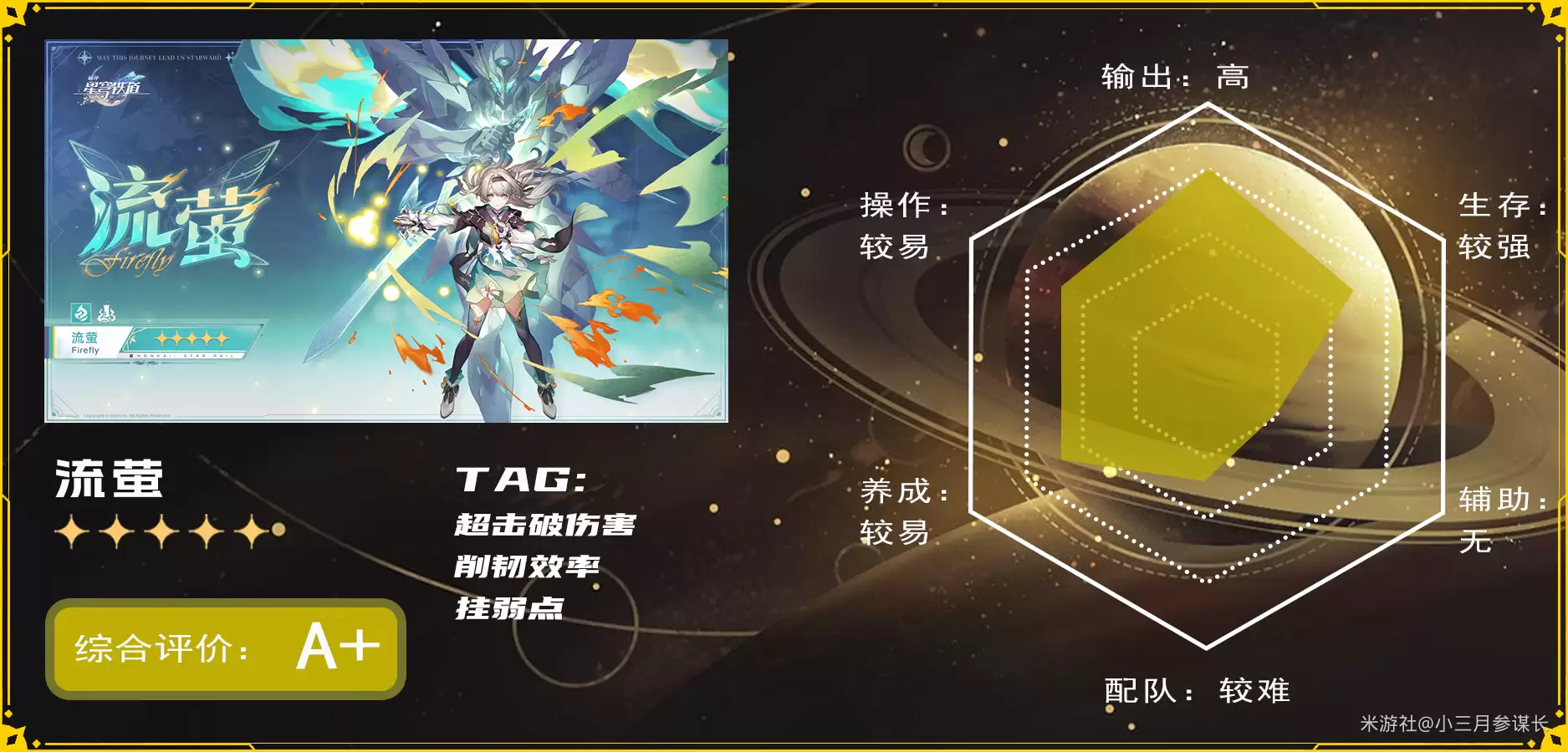 算上狼尊和绯英,流萤之后已经推出了整整30位限定五星。她虽然得到了加强,但主要优化的是倍率与续航,并未从根本上解决击破队固有的问题。(击破队的特色本是依靠击破后的超高爆发蒸发敌人,但随着新角色机制变化,击破后的输出空窗期、循环问题也逐渐凸显。)