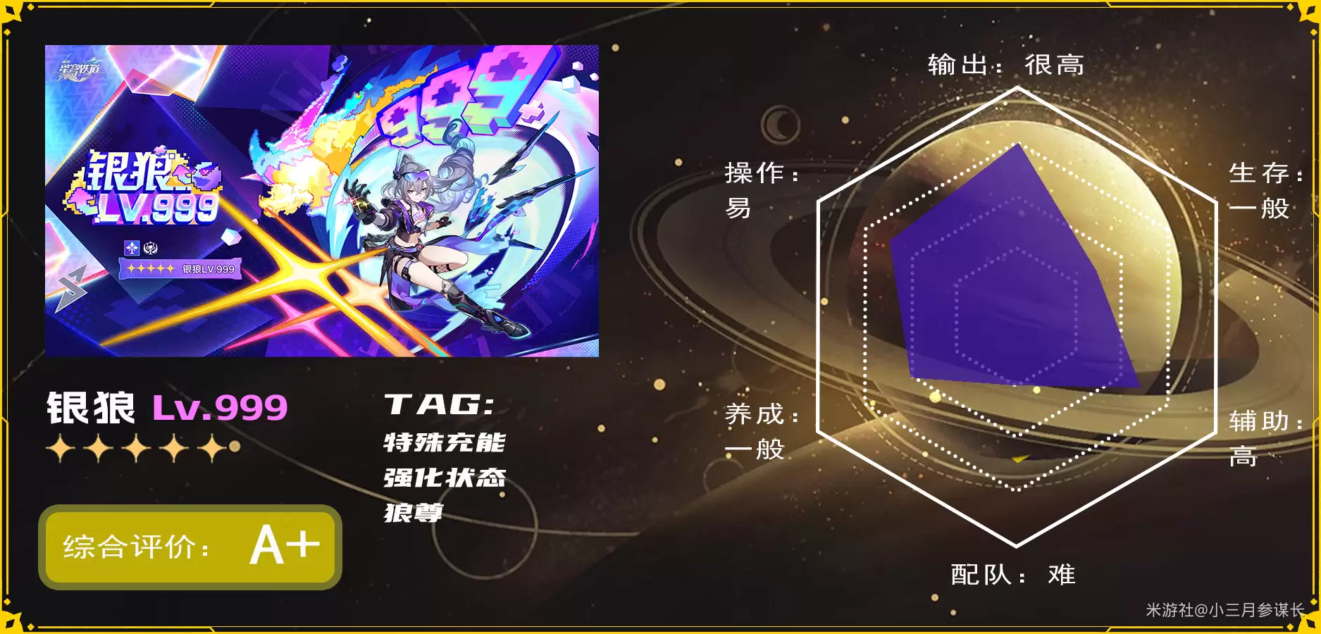 狼尊拥有解控能力的秘技,算是锦上添花。其自身的输出能力和输出灵活性都相当出色。好消息是,他强度在线;潜在的顾虑是,这份强势能持续多久尚不明朗。不过可以预期,在整个“二相乐园”版本,他应该都会保持强势地位。毕竟,欢愉体系后续必然会有新角色加入,狼尊“喝汤”的机会不会少。
