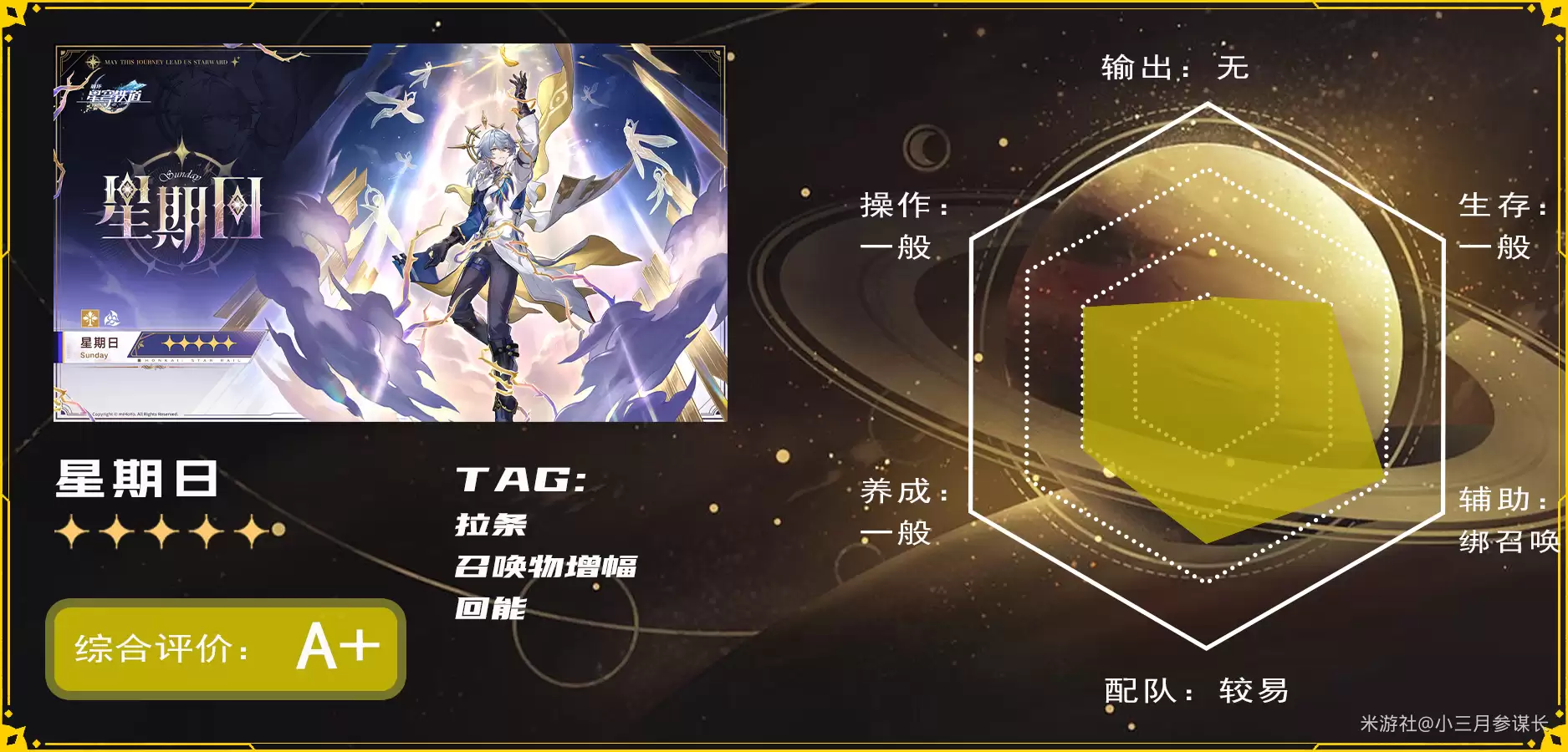 星期日是同谐命途的虚数角色,定位是召唤体系(包括“忆灵”)的泛用辅助。星期日登场时,其机制本就具备优势。随着“盾丹”这类角色的出现,更是弥补了星期日因队友缺少召唤物而损失增伤的问题。当然,这样也多少绑定了生存位的选择。总而言之,星期日的增伤能力非常强悍,功能性也足,是一位优秀的单体辅助。