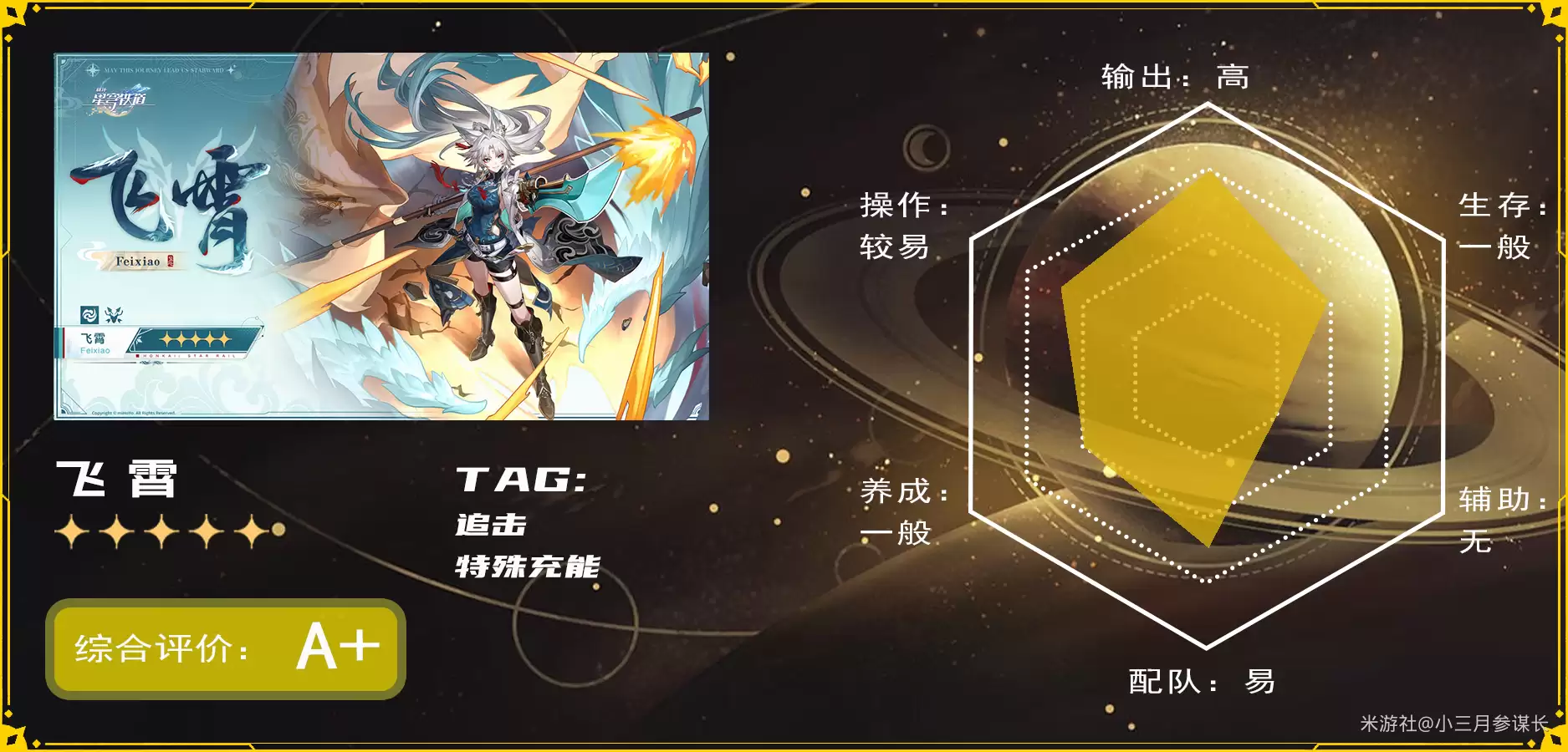 飞霄是巡猎命途的角色,以高频追加攻击为特色。在“不死途”提供了宝贵的增伤和对群优势后,整个追击队的使用手感得到了质的飞跃。如果你已经拥有了不死途,那么在资源允许的情况下,非常推荐抽取飞霄来组成完全体。