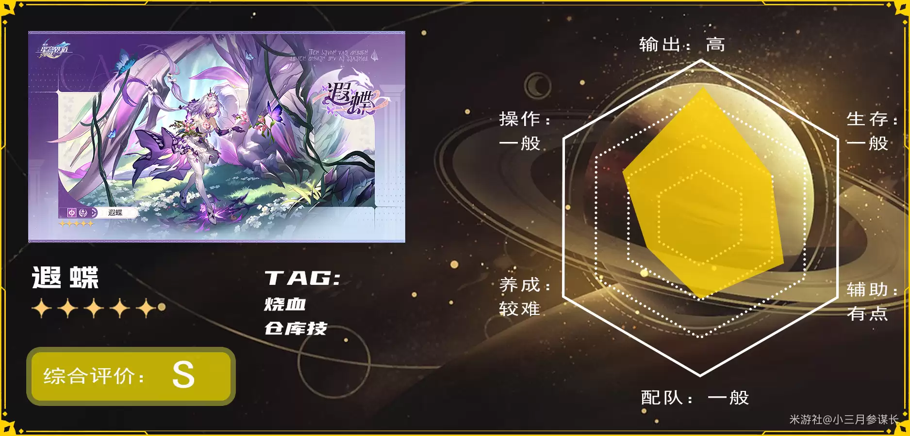 这里必须把话说清楚:遐蝶的输出,相当依赖队伍中生存位的质量(且只能携带治疗角色,护盾类的如丹砂金并不适用)。同时,她也需要像星期日、长夜月这类可靠的强力辅助。她的配队成本虽远不及欢愉体系那般夸张,但投入也不算小。所以,喜欢归喜欢,强归强,入手前仍需权衡自身资源。
