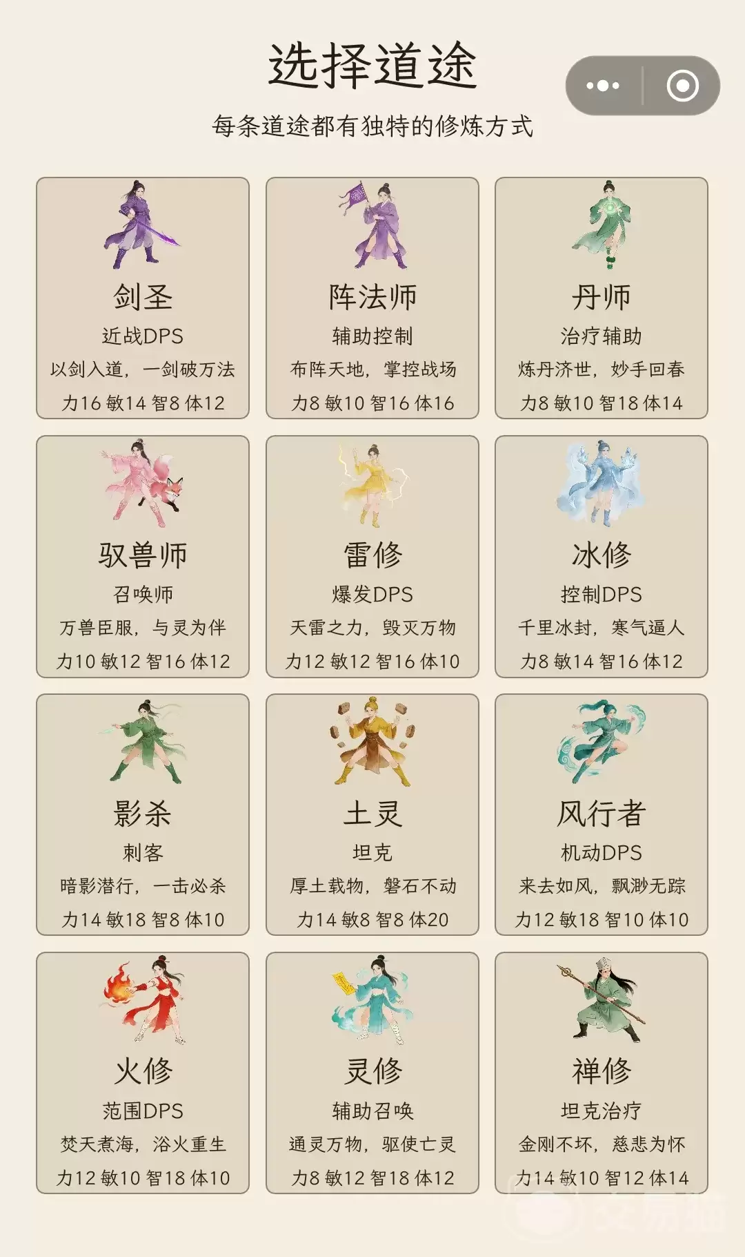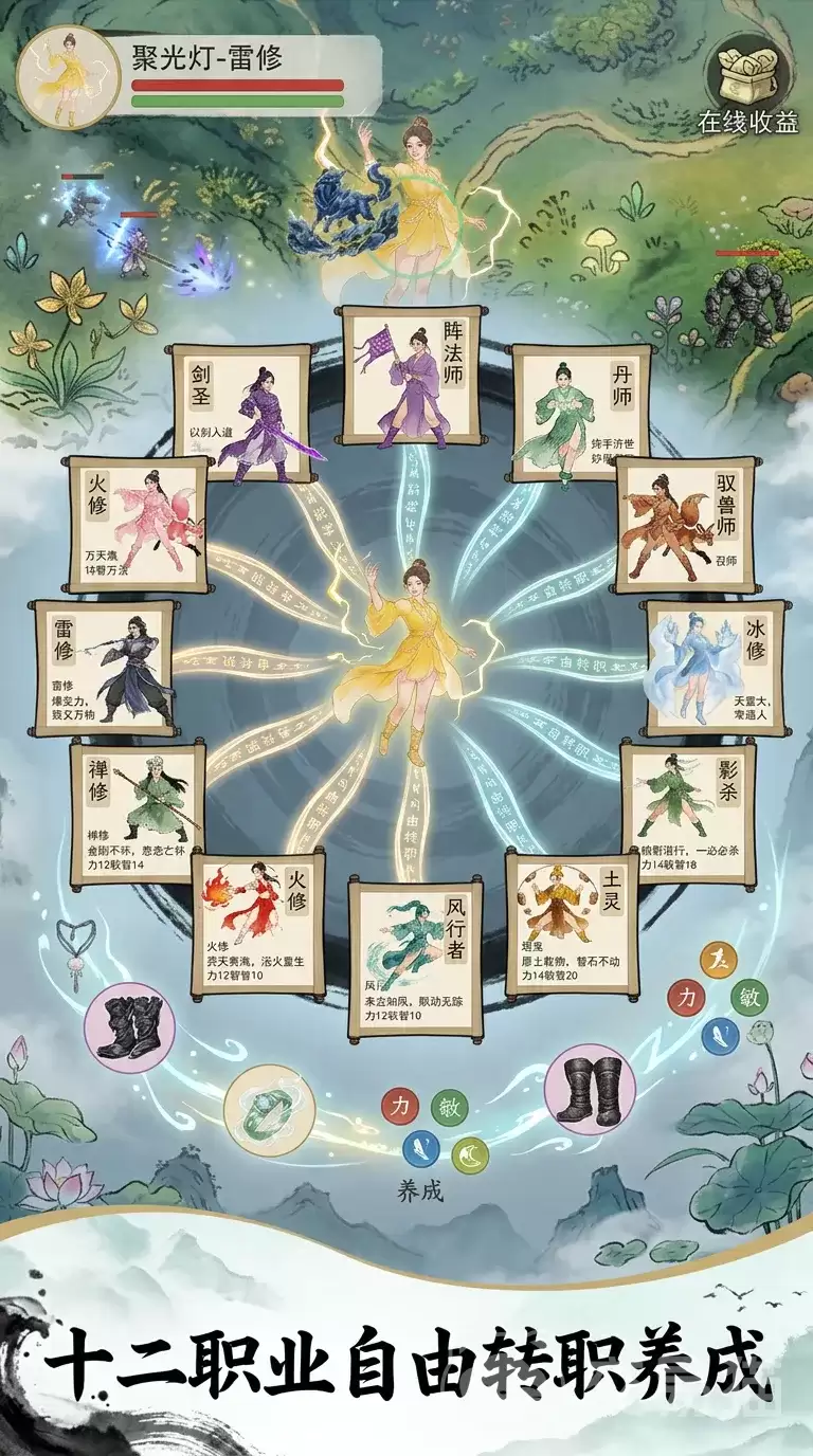 游戏的职业体系建立在属性专精的底层逻辑之上。以开局可选的“雷修”为例,其天生具备“天雷专精”特性,擅长高频率的群体伤害,在前期清怪冲级阶段效率突出。角色加点方面则提供了灵活的策略空间:纯粹追求极致输出的玩家,可以全力主加智力;而如果担心副本挑战失败带来惩罚,适当分配点数到体力上,则能显著提升生存容错率,让推图过程更加稳健。