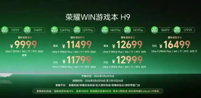 荣耀WIN游戏本 H9,国补到手价9999元起,5月6日全渠道首销。