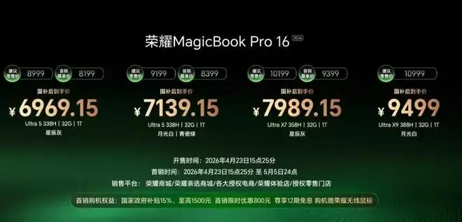 荣耀MagicBook Pro 16 2026,国补到手价6969.15元起。这两款现已全渠道开售。