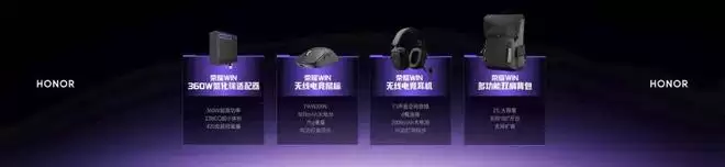 既然是全场景,周边配件自然少不了。发布会上,荣耀WIN 360W氮化镓适配器、无线电竞鼠标、无线电竞耳机、多功能双肩背包以及笔记本散热支架等一系列产品同步亮相,旨在打造一套完整的游戏装备生态。