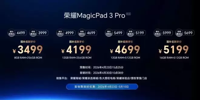 荣耀MagicPad 3 Pro 12.3超薄平板,国补到手价3499元起,4月30日起全渠道首销。
