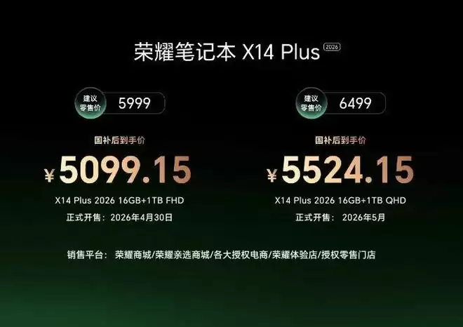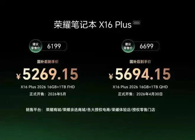 荣耀笔记本X Plus系列2026,国补到手价5099.15元起,4月30日起陆续全渠道开售。