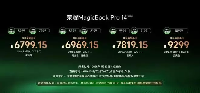 荣耀MagicBook Pro 14 2026,国补到手价6799.15元起。