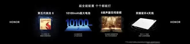 核心配置上,它搭载了第五代高通骁龙8旗舰芯片,配合荣耀冰封散热架构确保性能持久释放。内置10100mAh超大电池,支持66W超级快充和27W反向充电。通信方面有荣耀自研的星环四天线和双Wi-Fi7加速。影音体验则由八扬声器和第三代空间音频技术保驾护航。