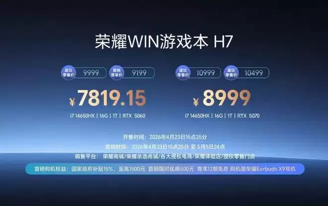荣耀WIN H7电竞游戏本发布:中高端市场迎来新玩家 4月23日,荣耀正式进军中高端电竞本市场,推出了全新的WIN H7系列。这款产品最高可搭载酷睿i7-14650HX处理器与RTX 5070显卡,在享受国家补贴后,起售价定在了7819元,性价比颇具看点。 核心性能:旗舰配置下的灵活选择 性能是游戏