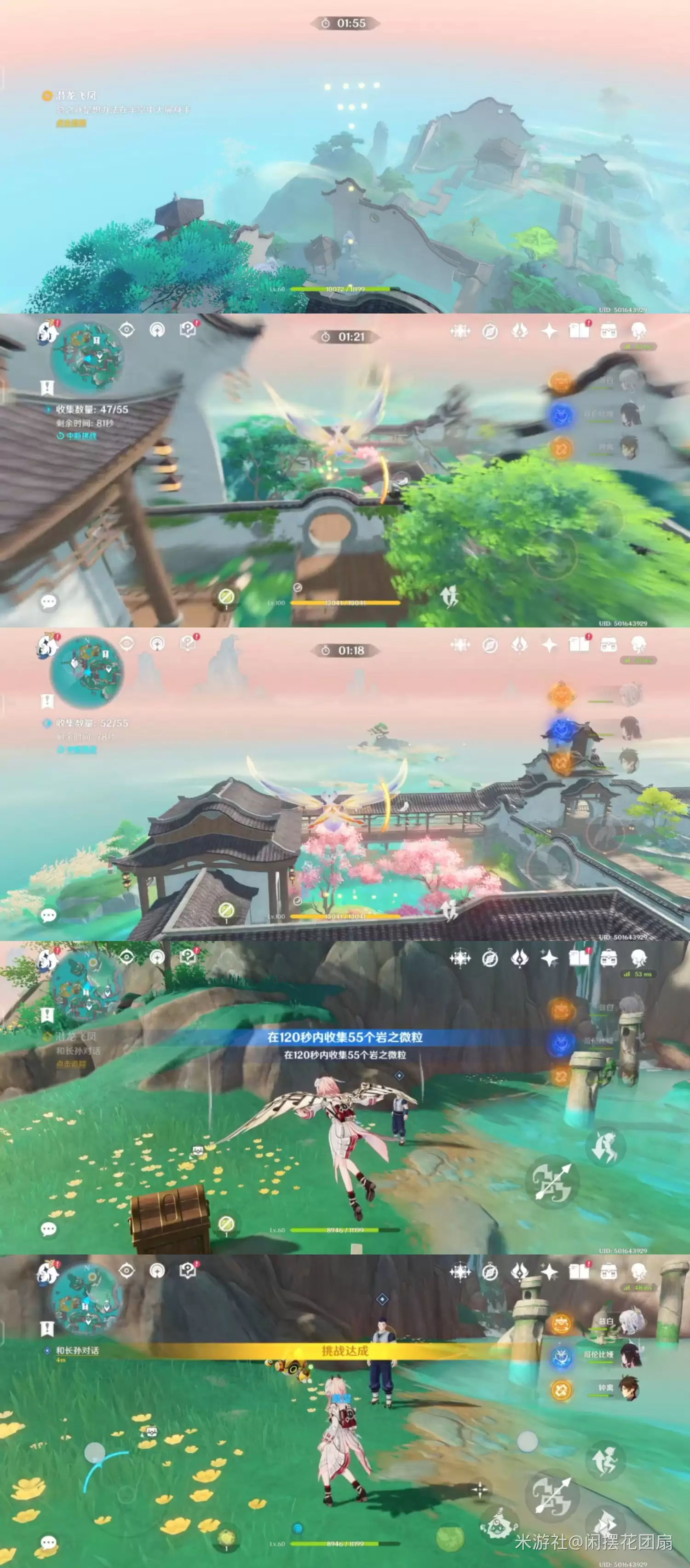与NPC长孙继璟对话后,第一个挑战开始。你需要沿着石柱拾取岩微粒。这个挑战难度不高,注意好路线即可。完成挑战后,靠近长孙继璟进入一段剧情,随后即可获得任务中的第一个普通宝箱。