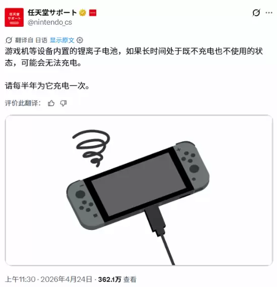 任天堂官方提醒:长期不用的Switch,记得给它“充个电” 最近,任天堂官方支持账号发布了一则推文,内容挺实在的,专门给那些把Switch等掌机“打入冷宫”的玩家提了个醒:你家里吃灰的游戏机,电池可能正在悄悄“受伤”。 官方说得挺明白:游戏机里那块锂离子电池,最怕的不是你用,而是你完全不用。如果设备