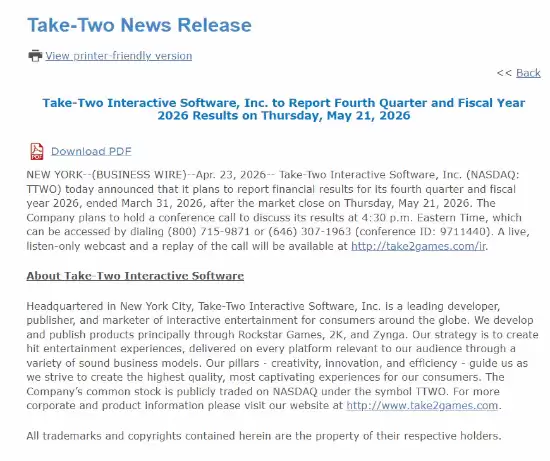据报道,Rockstar Games的母公司——Take-Two Interactive公布了下一季度财报的具体日期与时间,标志着《GTA6》营销进程中的一个关键节点或即将到来。 官方新闻稿已经确认,公司将于2026年5月21日(周四)股市收盘后,发布第四季度及整个2026财年的财务业绩。这份财报的
