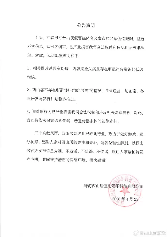 西山居严正声明:恶意谣言当止,公司运营一切如常 4月23日,游戏圈被一则官方声明刷屏。西山居游戏通过其官方渠道发布了一份措辞严厉的声明,直指近期在互联网上流传的恶意谣言。 声明开篇便明确指出,近日在各大平台出现的、假冒媒体名义发布的所谓“新闻截图”,纯属恶意伪造。这些图片不仅内容完全失实,甚至存在一