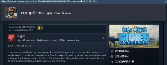 这位玩家在评价中详细阐述:“一旦安装并使用模组,游戏频繁的版本更新就会彻底破坏现有的游戏环境。但矛盾之处在于,这款游戏几乎必须依赖模组才能获得理想的体验——因为其原版内容在深度和丰富度上有所欠缺,部分设计甚至令人感到体验不佳。Paradox工作室似乎格外偏爱柔和的卡通渲染风格,以及一些在审美上较为独特的建筑造型。” 这段评论,实际上精准揭示了《城市:天际线》长期存在的一个结构性矛盾:其蓬勃的模组社区是游戏持久生命力的核心,但原版在视觉表现、游戏机制与内容深度上的不足,又迫使玩家不得不借助模组来补全体验。玩家的反馈,正是这一现状的真实写照。