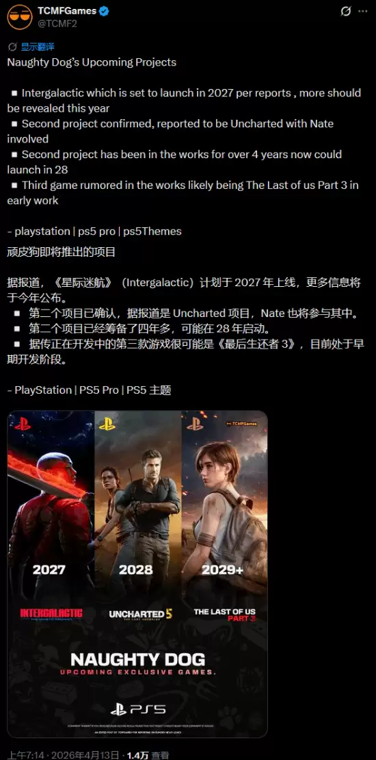 那么,顽皮狗到底在忙些什么?最近,知名游戏博主TCMFGames整合了近期的一系列爆料,为我们勾勒出了一幅可能的产品路线图。一起来看看。