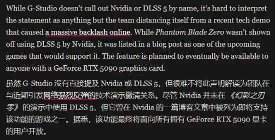 这一动态也迅速吸引了外媒Kotaku的报道。值得注意的是,其解读视角更为深入:尽管《影之刃零》的官方声明中并未提及英伟达或DLSS 5,但Kotaku分析认为,这份强调“纯粹人类创作”的声明,“很难不让人联想到其意图与之前引发网络巨大争议的AI技术演示保持距离”。