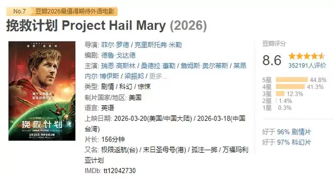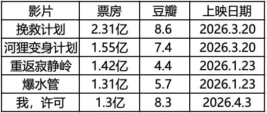 看一眼2026年的票房榜单就一目了然:剔除春节档影片,目前年度票房榜前三甲,清一色被引进片占据。其中,《挽救计划》的表现远超预期,不仅拿下了豆瓣8.6分的神级口碑,市场走势也异常坚挺,长线表现突出,目前累计票房已突破2.3亿,最终落点预计在2.6亿左右。要知道,这可不是传统意义上的好莱坞爆米花大片,能靠过硬品质赢得市场,实属难得。