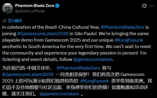 近日,官方发布重磅消息,为游戏热度再添新柴。为积极响应“中巴文化年”的友好交流倡议,《影之刃零》确认将参展在巴西圣保罗举办的2026年科隆拉美游戏展。此举标志着南美玩家与游戏媒体将首次有机会在现场零距离体验这款国产3A级武侠大作的震撼魅力与流畅战斗。