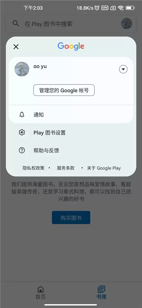谷歌图书App家长控制设置教程 想为孩子打造一个更纯净的电子阅读环境?谷歌图书App内置的家长控制功能,几步就能轻松搞定。下面这个分步指南,带你快速上手。 第一步,启动谷歌图书App后,首先点击屏幕右上角的用户“头像”。 点击之后,你会看到一个简洁的菜单弹窗。在这里,找到并选择“Play图书设置”这