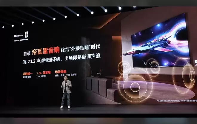 为了打造「电视好声音」,海信联合帝瓦雷打造了 2.1.2 声道影院级音响,拥有 165W 峰值功率。系统侧则升级为超级小聚 AIOS,支持更自然的模糊指令识别。