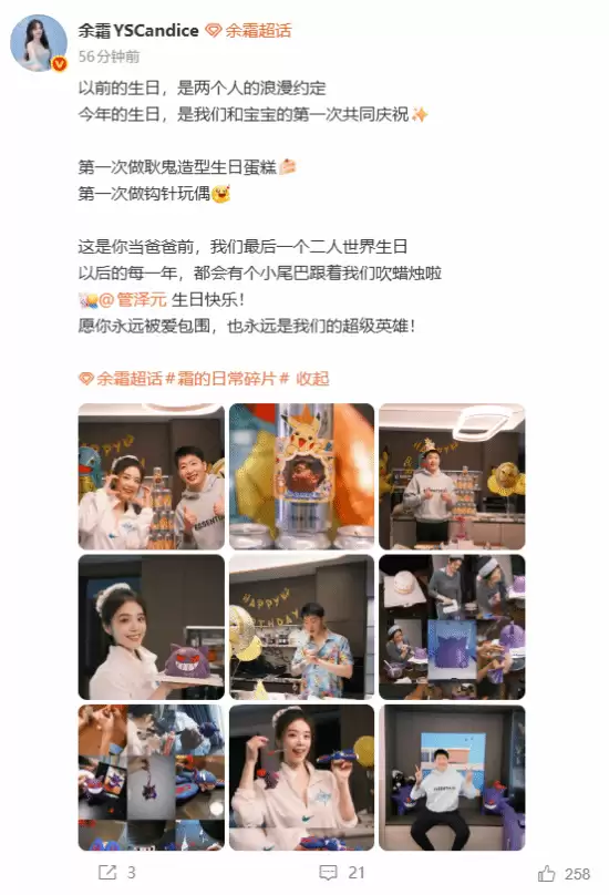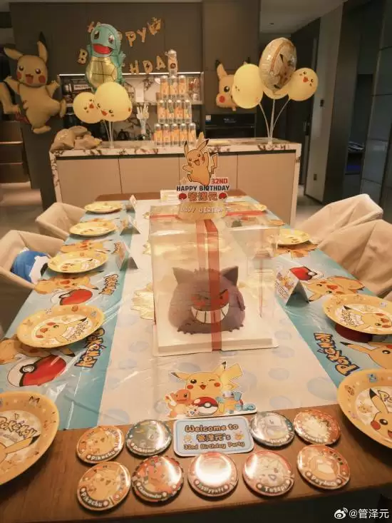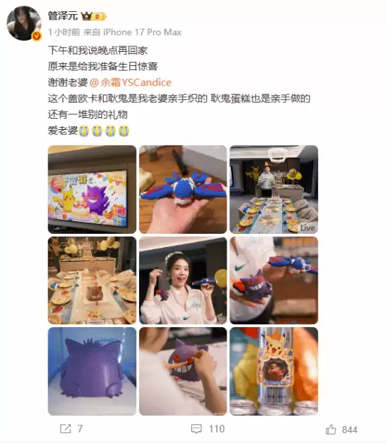 管泽元在微博中写道:“下午和我说晚点再回家,原来是给我准备生日惊喜。谢谢老婆@余霜YSCandice。” 他特别提到,照片中的宝可梦盖欧卡和耿鬼玩偶是妻子亲手编织的,就连造型别致的耿鬼主题蛋糕也是亲手制作。此外,还有“一堆别的礼物”。微博最后,他甜蜜地表达了“爱老婆”。