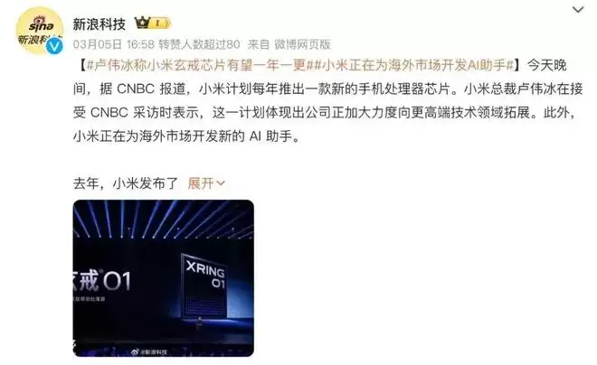 IT之家消息,小米集团总裁卢伟冰今日在接受CNBC采访时表示,小米自研的玄戒O1芯片将有望实现每年一更的迭代节奏,并计划未来为海外市场开发专属AI助手。卢伟冰透露,去年发布的玄戒O1采用3nm先进制