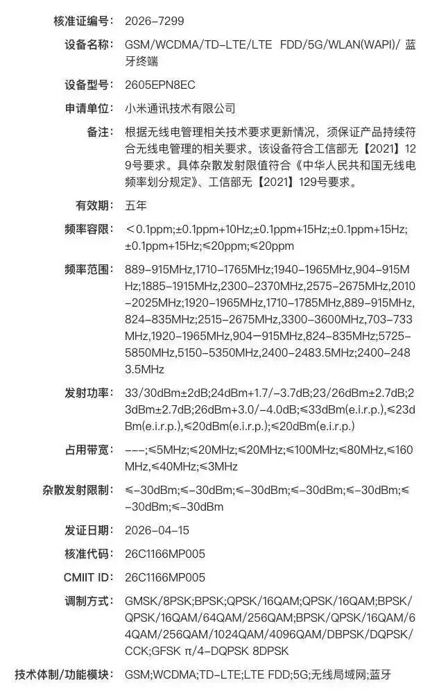 据悉,一款型号为2605EPN8EC的小米新机已通过认证。虽然认证信息未明确产品系列,但业内推测它极有可能就是即将发布的小米17 Max。