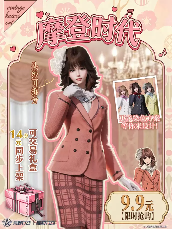 说到复古,怎么能少了一套标志性的行头?为了精准复刻那份时代的精髓,我们特别准备了【摩登时代】复古粉装系列。这套装扮可不是简单的复刻,它加入了可染色的现代巧思,让你在经典框架下,也能玩出属于自己的个性色彩。记住上线时间:4月26日上午10点,准备好迎接这场时光之旅。