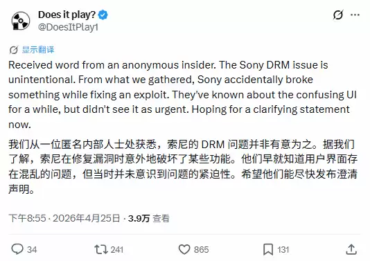 此前,外网消息源透露,目前PlayStation在PS4和PS5的数字版游戏中加入了DRM验证(正版在线验证)机制。