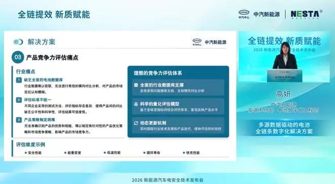 动力电池作为整车的核心能量来源,其研发水平直接决定了车辆的续航与安全表现。中汽新能源的能源系统团队依托海量真实测试数据与先进算法,构建了一套覆盖电池全链条的数字化服务能力。这套能力能提供什么?从电池产品综合竞争力评估,到整车热安全、电池包热安全、底部防护等关键场景的对标数据库,再到测试方案的行业对标与优化。它旨在支持企业实现从研发、设计、验证到标准制定的全流程正向开发,从而全面提升电池及整车企业的技术领先优势。